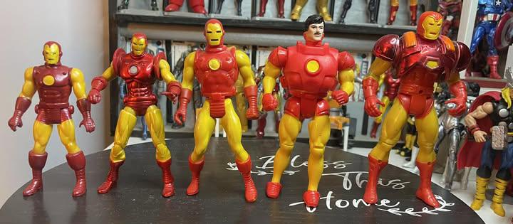 This is a size comparison of the 3.75" retro line, the 4" Iron Man 2 line, the Secret Wars line, the Marvel Superheroes line and the Iron Man cartoon line at 5".