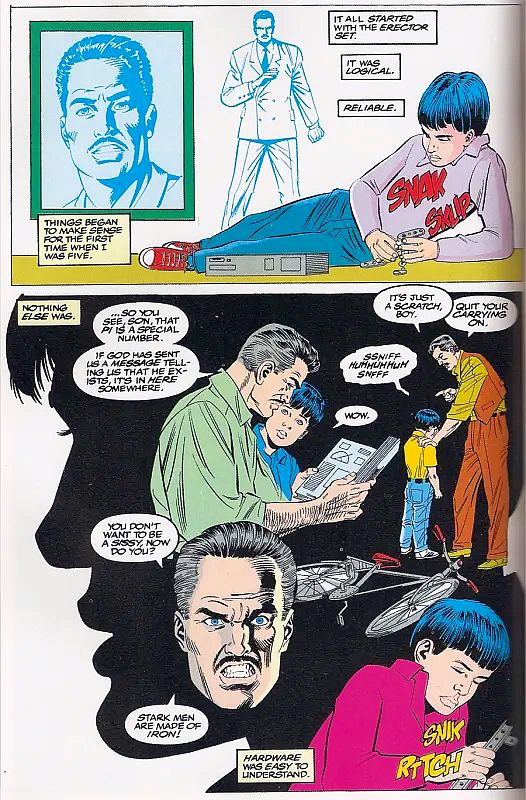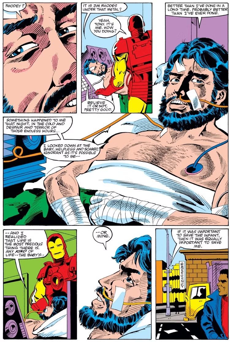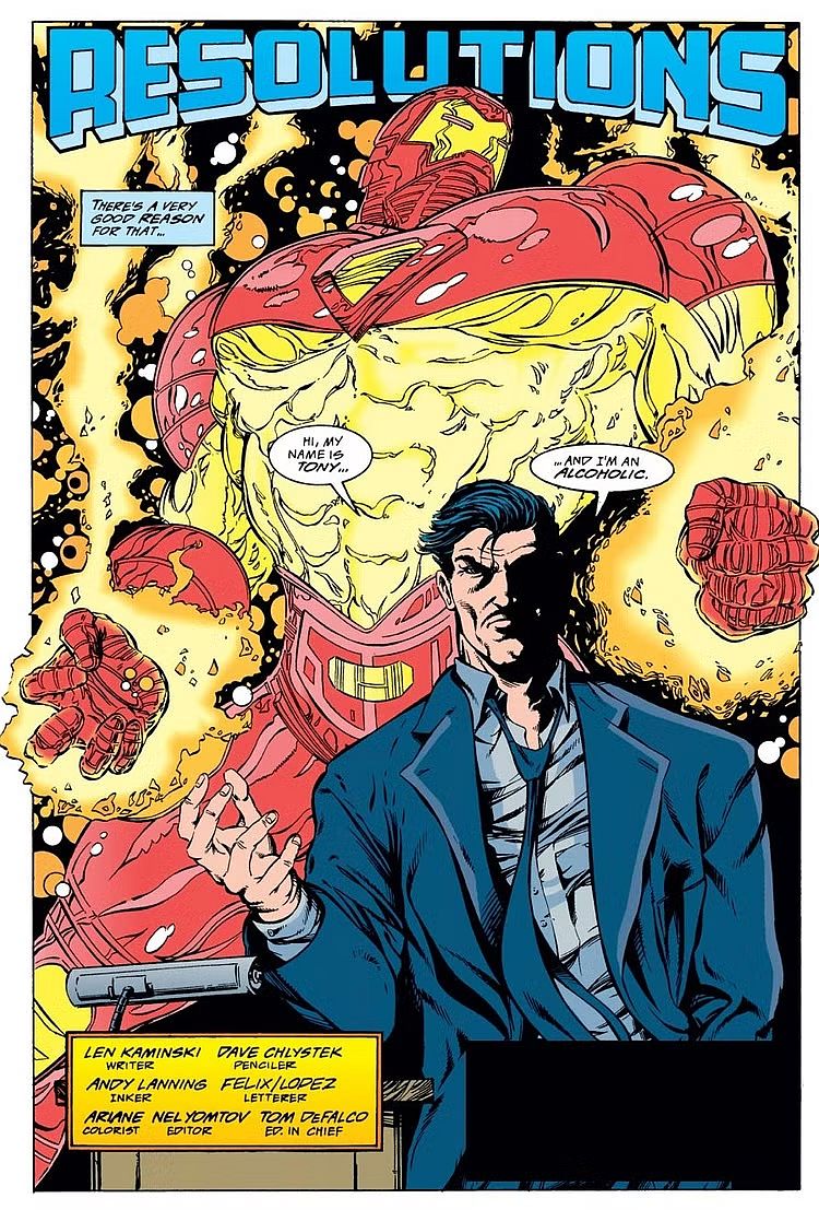 Tony Stark and his beliefs. Tony Stark's dad once talked with Tony about finding a message from God in mathematics. Tony once visited his dad in hell. Tony became an alcoholic. Then he went to Alcoholics Anonymous, first seen in Marvel Comics Presents #8. He maintains his sobriety, although, he has fallen off the wagon a few times in addition to a few times being controlled or manipulated. We still see Tony going to AA meetings and helping other heroes that are alcoholics. Iron Man V1, 128 - first addressed it in Demon in a Bottle. Then, in Iron Man V1, 169 when Rhodey had to take over because he relapsed. And, IM, V1, 182 when he is on the streets and a homeless woman dies giving birth. He saves the baby and is hospitalized. In IM, V1, 313, we see Tony going to an AA meeting.