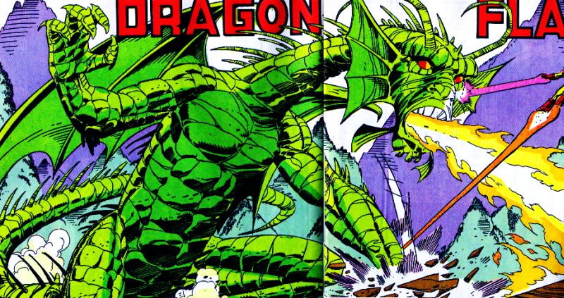 First seen in Strange Tales #89. Another villain is Fin Fang Foom. His name means "he whose limbs shatter mountains, and whose back scraps the sun." His first appearance in Iron Man is 261 when he is awakened by the Mandarin. He is an ancient alien dragon that crash landed on earth thousands of years ago. It is his world's technology that powered the ship that brought him to Earth. The Mandarin fashioned these power sources into ten deadly rings. He has sought to obtain the power of these rings to open a gateway back to his world to unleash the take over of Earth.