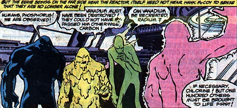 Roll Call: The originals were just Vanadium, Carbon, Phosphorus, Chlorine, Radium and Cobalt. The new generation's improved versions consisted of all these and lots more, though only thirty-seven were identified out of "all one hundred and nine!" (There may be a hundred and eleven elements, but who's counting?)