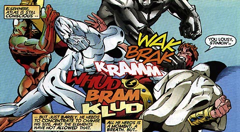 Favorite Quote: "We have no reason to hide our origins, human -- all you needed to do was ask us!" (Thunderbolts 6.) Phosphorus agrees with Sodium's analysis of their enemies as "pathetic." This is in keeping with the general Elemental attitude, thinking just 'coz everything's composed of them they're hot stuff. (Which he was, but that's phosphorus for you...)