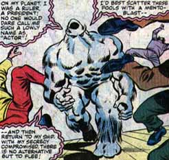 Powers: Originally a twenty-foot colossus, Xemnu has assumed a more modest eleven-foot height since recreating his body. He has immense superhuman strength and durability on a par with his namesake, the Hulk, and is a brilliant scientist with particular expertise in genetics. His mental powers include: telepathy; hypnosis; mental possession of other bodies, which he can then psionically restructure to resemble his own form; imposition of mental blocks on others; psionic force bolts; animation and restructuring of inanimate objects; and the creation of "atmos-spheres", protective bubbles of psionic energy in which he can fly.