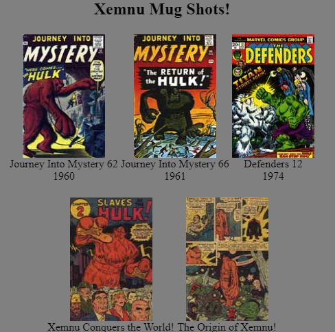 Special Thanks To: Jeanne the editor here. I'd like to thank T.C. at Good Guys, Bad Guys Comics and Collectibles in San Diego. He loaned me the store copy of the ultra-rare Journey Into Mystery 62, Xemnu's first appearance, for some of the images on this page.