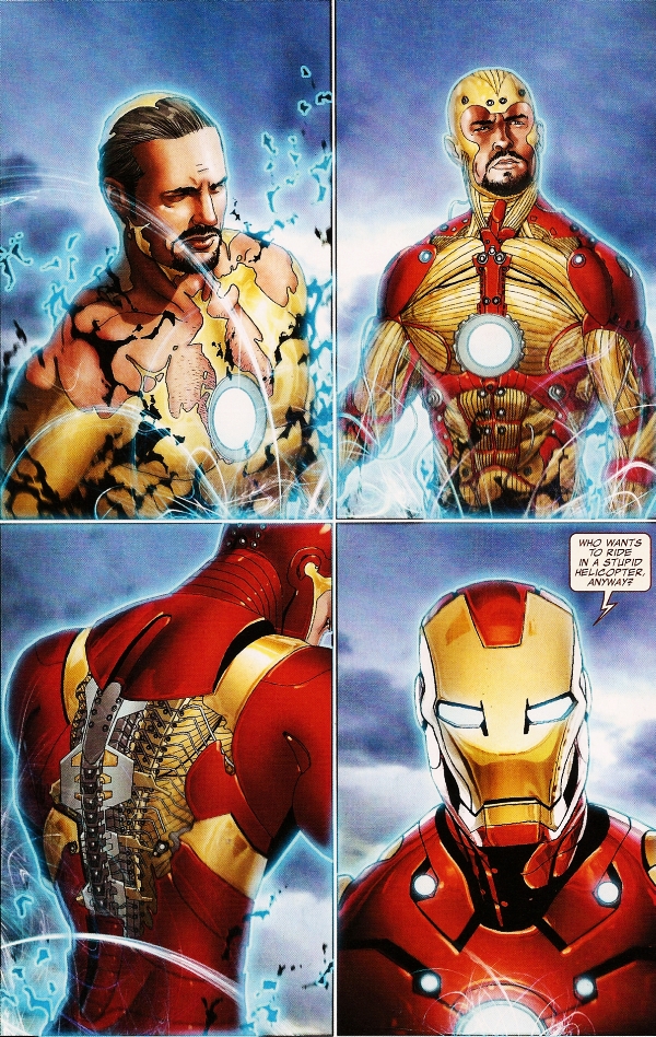 The Model XXIV - AKA The Extremis Armor appeared in Iron Man Vol. 4, #1. Although the armor looks unchanged from the previous model. I added the Extremis technology to keep me from dying and to stop someone else who took the nanite Super-Soldier injection. It was created by my friend, Maya Hansen, as a military solution to the Super Soldier serum. This injection rewrites the body from the memory center of the brain. It recreates bones and organs, that in my case, provides an improvement on the one system that was the weakest part of the armor, my body. Now my armor is integrated into my body.