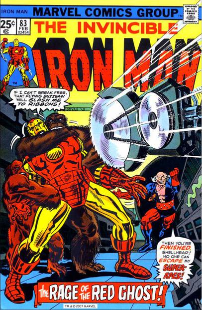 Ersatz (and injured) Iron Man Happy Hogan has to fend off questions from Michael O'Brien while Tony Stark is forced to help the Red Ghost restore his body to a tangible state. Midling story. Trimpe's pencils are frankly pretty lousy. Severin's inks make Red Ghost look pretty good, but they fail her when rendering still-pointy-nosed Iron Man.